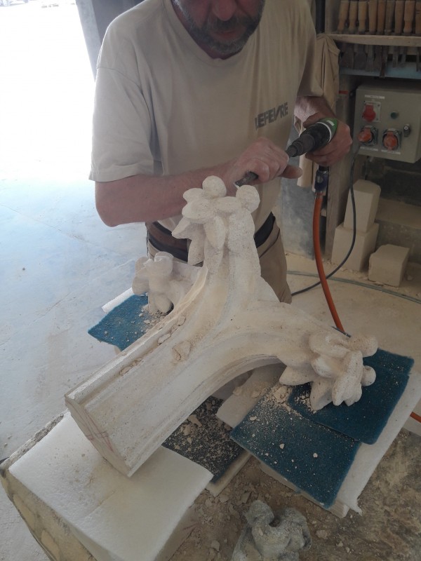 La photo principale concerne le sculpture du fleuron de l'épî de faitage du fronton de cette lucarne en cours de reconstitution.